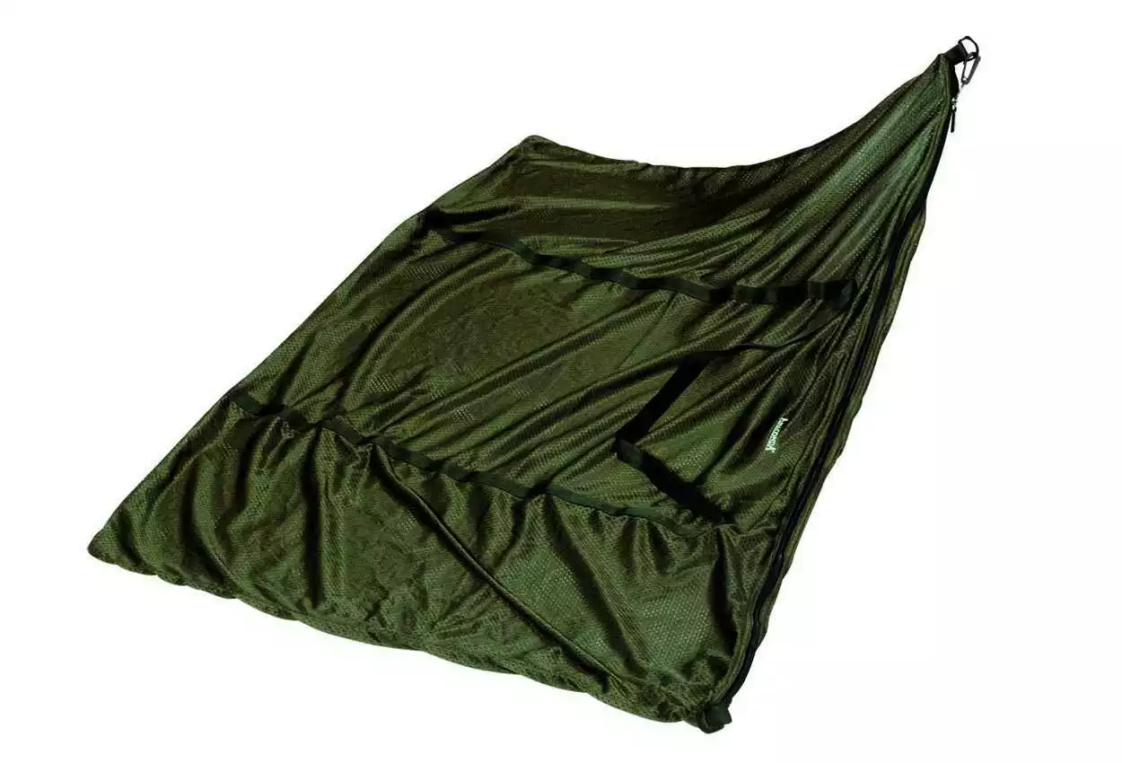 Klassischer Carpsack mit Reißverschluss und durchgenähten Riemen. So kann er auch zum Wiegen eingesetzt werden. Der Reißverschluss lässt sich mittels eines Karabinerhakens noch zusätzlich sichern. Durch die Transporttasche entstehen keine unangenehmen Gerüche und sie garantiert ein kleines Packmaß.